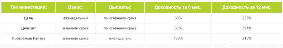 Инвестиционное предложение заключается в наличии 3 видов тарифов. Доходность как таковая выбирается исключительно инвестором. Вклады делаются понедельно, какое количество недель выберете, такой множитель доходности получите. Распределяются тарифы так: