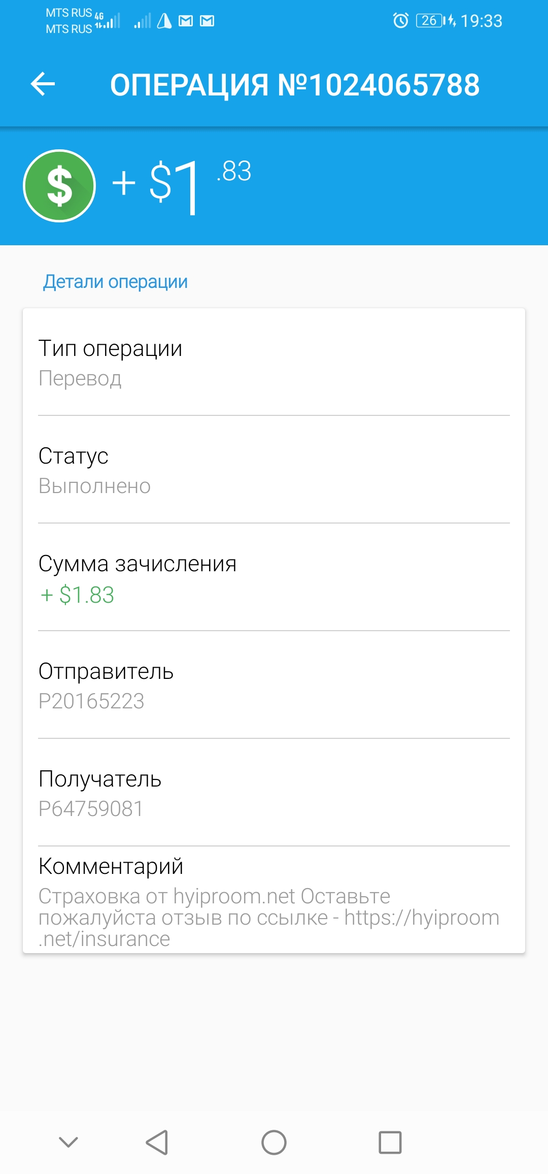 Дата операции: 11 Май 2020 13:41 ID операции: 1024924124 Тип операции: перевод Статус: выполнен Сумма получения: 0.33 $ Комментарий: Страховка от hyiproom.net От: P20165223 Спасибо!